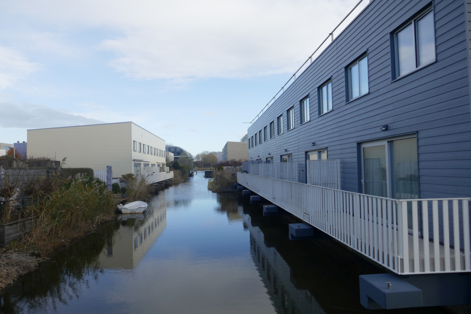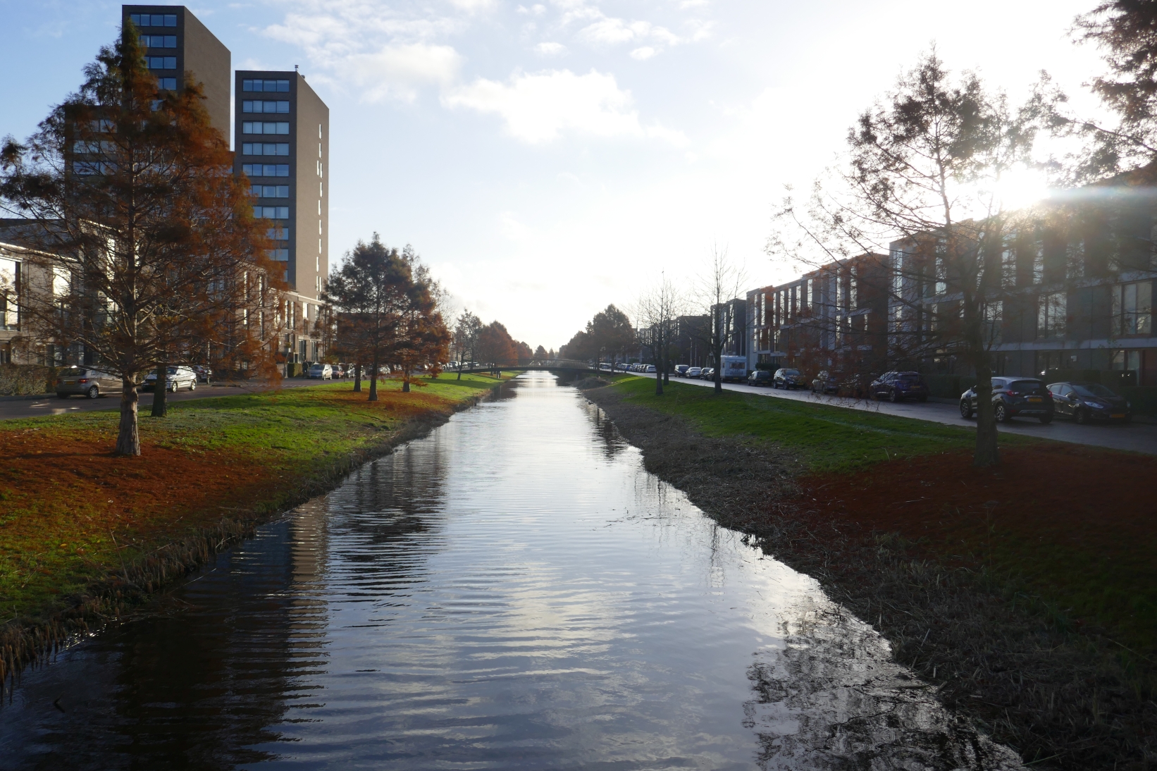 We lopen tegen water aan, gaan naar rechts en wandelen langs een school. De eerste brug nemen we linksaf en nu volgt een kort stuk dwars door een woonwijkje met steeds links en rechts van ons korte straten die aan watertjes zijn gelegen, met compacte huizen. Deze vormen weer een geheel ander karakter van deze VINEX-wijk, die zeker afwisselend kan worden genoemd. Bijgaande foto geeft een goede indruk van hoe dergelijke straten zijn gelegen aan de ‘dwarswatertjes’.