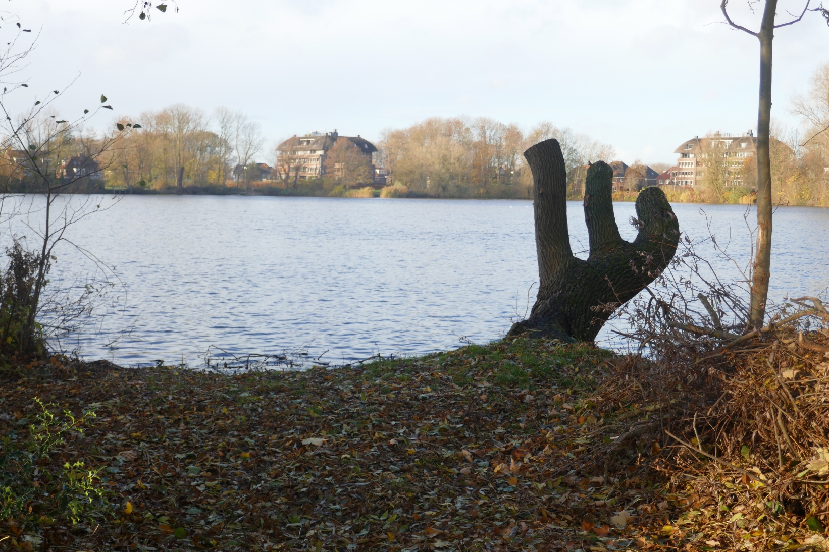 Nu volgt een mooi gedeelte van de wandeling, waarbij we zelfs volledig onverhard lopen. We ronden namelijk de in de deelwijk Boswijk gelegen Bosplas en volgen een kronkelig pad door een heus bos met aan de linkerhand voortdurend een groot water met uitzicht op grote appartementencomplexen aan de overkant. Niets doet je denken dat je in een grote woonwijk loopt, hier lijk je midden in de natuur te vertoeven. Opmerkelijk ! De eerlijkheid gebiedt te zeggen dat er veel andere mooie en natuurlijke plekken in deze wijk zijn te vinden, maar geen enkele heeft dít effect van ‘pure natuur’.