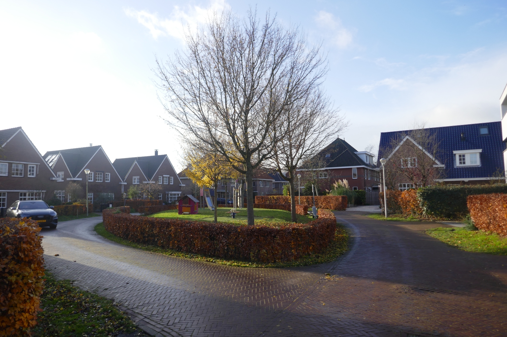 Nadat we de Bosplas voor driekwart hebben gerond, gaan we op een open terrein naar rechts en betreden de zeer ruim opgezette deelwijk Boswijk, die veelal uit (half-)vrijstaande en grote huizen bestaat. Hier kunnen we gebruik maken van leuke smalle paadjes die de wijk dwars doorsteken, en de groene opzet maar ook de architectuur laten zien. Enkele malen steken we ‘gewone’ woonstraten over, maar lopen dan weer tussen huizen door of door groen, en we kruisen een mooi, ovaalvormig, plein halverwege deze deelwijk, zie bijgaande foto.