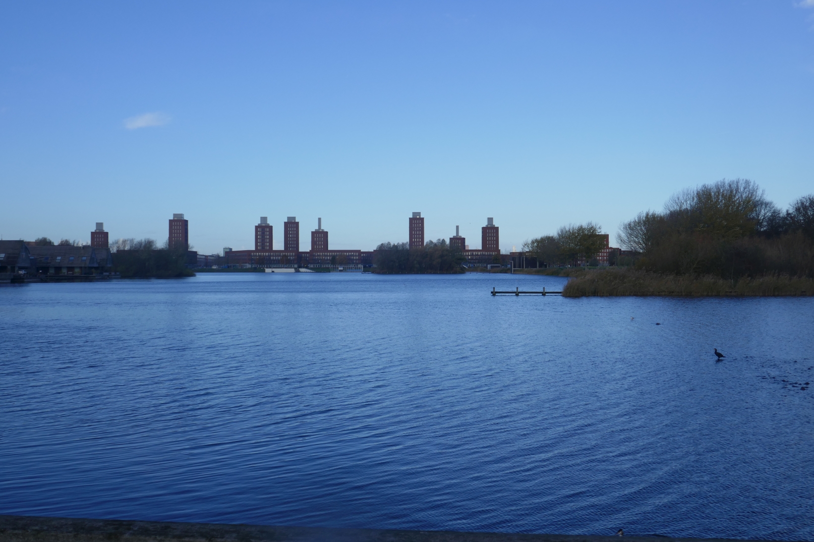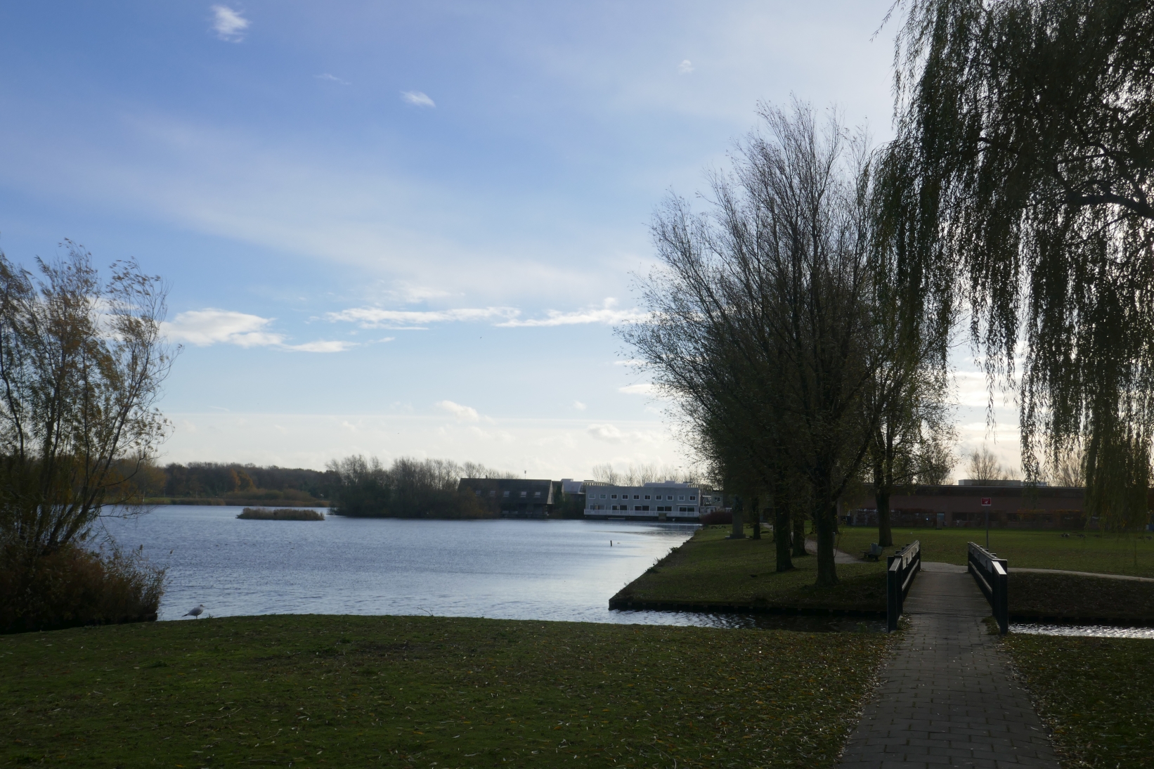 Kort nadat we de plek waar de voorgaande foto genomen is zijn gepasseerd slaan we bij een fiets- en voetgangersbruggetje rechtsaf, steken het fietspad over (want juist hier stopt de Rijswijkse Landingsbaan als ‘autostraat’ en gaat over in een fietspad) en via een bruggetje bereiken we het evenemententerrein Böttgerwater, met rechts van ons in de verte huizen en links van ons een grote waterplas, die de ‘Blauwe Loper’ heet. Ook deze plas gaan we ronden en tussendoor kunnen we genieten van natuur en architectuur.