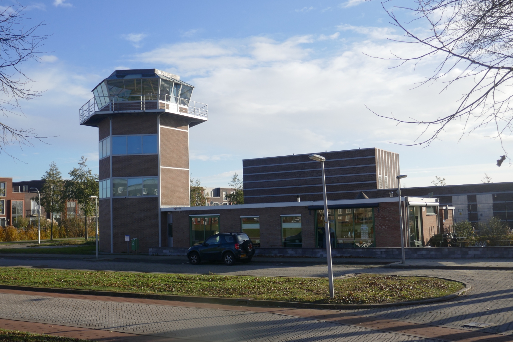Een prettig gedeelte van de wandeling, kunnen we wel zeggen al lopend over dit ruime en kaarsrechte pad. Aan het eind bereiken we weer de Rijswijkse Landingsbaan, maar omdat we inmiddels aan de rechterkant Nootdorp hebben liggen heet het vanaf hier de Nootdorpse Landingsbaan. We gaan rechtsaf en volgen de baan met het water links van ons. Even verderop een tastbaar overblijfsel van het vliegveld Ypenburg: het gerestaureerde torentje dat de luchtverkeersleiding heeft gehuisvest. Dat het geen groot en belangrijk vliegveld was is in de grootte en de hoogte van het torentje wel af te lezen !