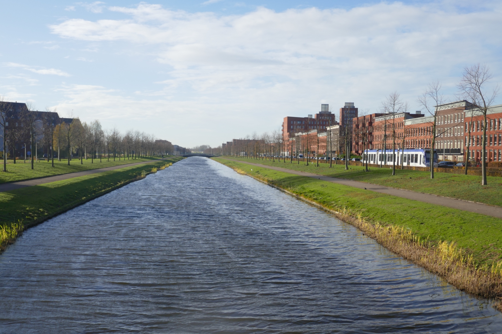 We arriveren bij het drukke kruispunt van de Laan van Hoornwijck en de Ypenburgse Boslaan, die hier overgaat in de Singel. In de verte zien we het centrale winkelcentrum van de wijk Ypenburg, maar wij gaan naar rechts en wandelen aan de overkant van het water van de Singel langs rijtjeshuizen, met rechts van ons een fraai begroeide waterkant. Nu volgt een lang stuk over de Bléroitlaan en de Ballangéelaan, waarna we naar links gaan en door een plantsoen (met rechts van ons de snelweg A13) de Rijswijkse Landingsbaan bereiken. Deze vormt de kaarsrechte hoofdader van de wijk. Gelukkig is deze straat zéér ruim opgezet, en bestaat eigenlijk uit twee aparte straten, met in het midden een breed water met aan beide zijden fiets- en voetpaden met daarachter een afwisselende bebouwing, en aan één zijde ook nog de trambaan. Wij lopen aan de rechterzijde van het water, met prachtige uitzichten in de verte op water, bruggen en daar bovenuitstekende architectuur, een bijzonder beeld. Zie bijgaande foto die genomen is nadat we al een tijdje langs het water hebben gelopen en het eerder genoemde winkelcentrum nu aan de andere zijde hebben gepasseerd.